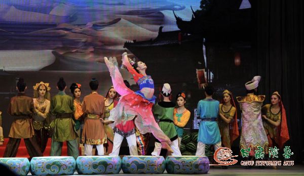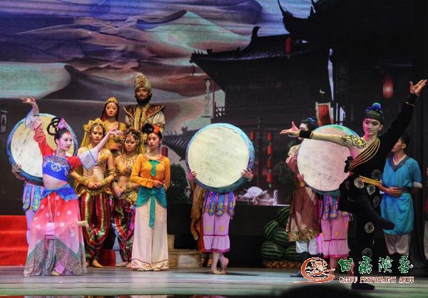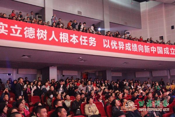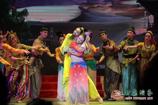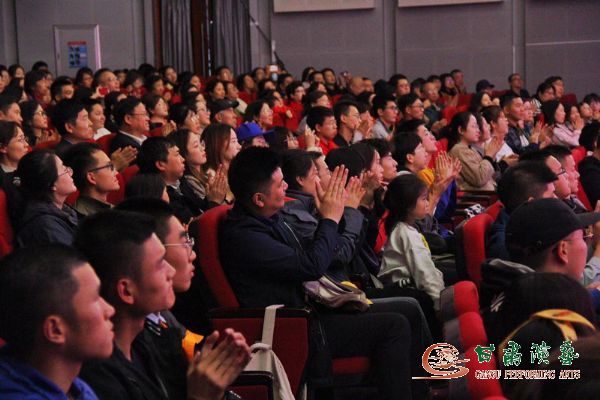 10月9日晚,由教育部、文化和旅游部、財(cái)政部共同主辦的“2019年高雅藝術(shù)進(jìn)校園活動(dòng)”甘肅省歌舞劇院舞劇《絲路花雨》在沈陽(yáng)航空航天大學(xué)藍(lán)天劇場(chǎng)隆重上演。全校近千余名師生共同欣賞了這場(chǎng)美妙絕倫的舞蹈盛宴?!?br/> 演出下午,甘肅省歌舞劇院舞蹈團(tuán)演員為沈陽(yáng)航空航天大學(xué)部分師生進(jìn)行了芭蕾舞基訓(xùn)課、舞蹈技巧、民族民間舞以及敦煌舞等舞種的生動(dòng)講解和展示,廣大師生不禁為舞蹈演員的高超技藝響起陣陣掌聲?!?br/> 晚6時(shí)整,大幕在觀眾們的期盼中緩緩開(kāi)啟,絢彩的舞美效果、豐富的舞蹈造型、唯美的中國(guó)故事為師生們帶來(lái)了一場(chǎng)視覺(jué)與精神的藝術(shù)盛宴。伴隨著鮮花和掌聲,此次2019年高雅藝術(shù)進(jìn)校園活動(dòng)舞劇《絲路花雨》也正式拉開(kāi)了走進(jìn)東北三省高校演出的帷幕。