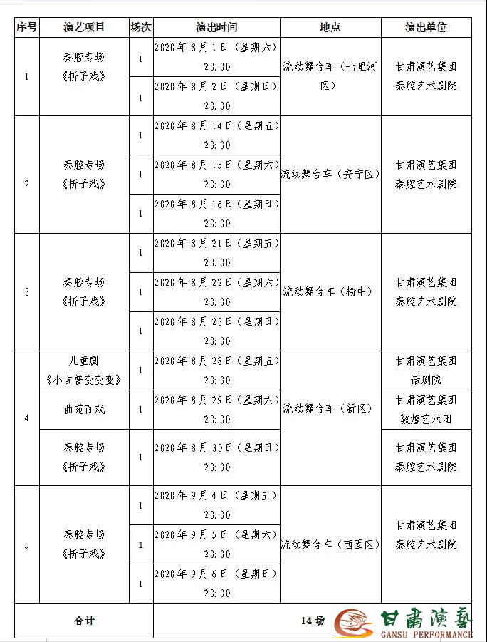 本次藝術(shù)節(jié)從7月31日晚開始,到9月13日結(jié)束,歷時(shí)45天,分為主場(chǎng)館文化廣場(chǎng)舞臺(tái)演藝、分劇場(chǎng)惠民演出、流動(dòng)舞臺(tái)車精品劇目巡回展演、蘭州隍廟百姓戲臺(tái)演出等四個(gè)板塊。