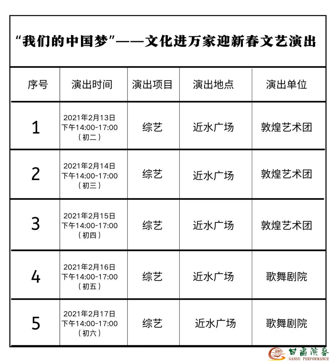 令人期待的是,從正月初二至初六,在蘭州市城關(guān)區(qū)近水廣場(chǎng),每天下午兩點(diǎn)到五點(diǎn),演出三個(gè)小時(shí)綜藝類節(jié)目,陪在蘭過年的朋友們一起度過這個(gè)難忘的春節(jié)。