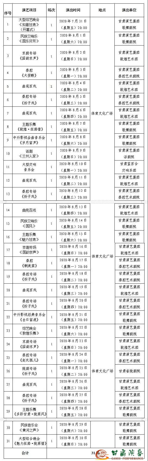 藝術(shù)節(jié)演出內(nèi)容涵蓋歌舞、民族交響樂、戲劇、曲藝、兒童劇、舞劇、話劇等多種藝術(shù)形式,共計演出100場。藝術(shù)節(jié)主場館設(shè)在蘭州市體育公園,每晚8時演出一場,由省直藝術(shù)院團(tuán)輪番上演大型綜藝晚會《如意甘肅》《敦煌樂舞》《魅力絲路·隴原情》、民族交響樂《國樂芬芳》《國風(fēng)》《黃河之聲》、主題樂舞《敦煌·絲路情》《魅力甘肅》《多彩甘肅·隴原風(fēng)》、音樂會《歲月留聲》、話劇《蘭州人家》、京劇《國韻京聲》、秦腔《大登殿》《鍘美案》《趙氏孤兒》,以及隴劇、秦腔折子戲?qū)龊颓嚲C合晚會《曲苑百戲》等經(jīng)典劇目,共計演出31場,每場一個主題。分劇場設(shè)在黃河劇院、東風(fēng)劇院、人民劇院、77演藝工場等演出場所,著力打造音樂會+戲曲+兒童?。拕〉难莩鲂问?,主要上演大型戲曲綜藝晚會《梨園風(fēng)采》、京劇《梨園春色-折子戲》、秦腔《清風(fēng)亭》《火焰駒》、隴劇《假婿乘龍》、音樂劇《花兒與少年》、話劇《老柿子樹》、兒童劇《綠野仙蹤》和鋼琴重奏音樂會等凸顯甘肅文化特色的精品劇目和體現(xiàn)出甘肅文化名片的品牌劇目。