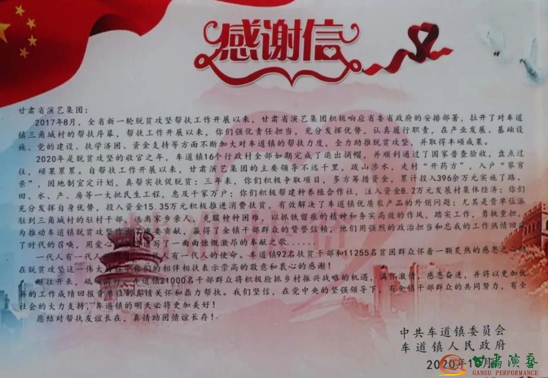 演出開始前,中共車道鎮(zhèn)委員會、車道鎮(zhèn)人民政府為甘肅演藝集團贈送了一封感謝信,并對甘肅演藝集團三年來的對口幫扶工作給予了高度肯定和衷心感謝!