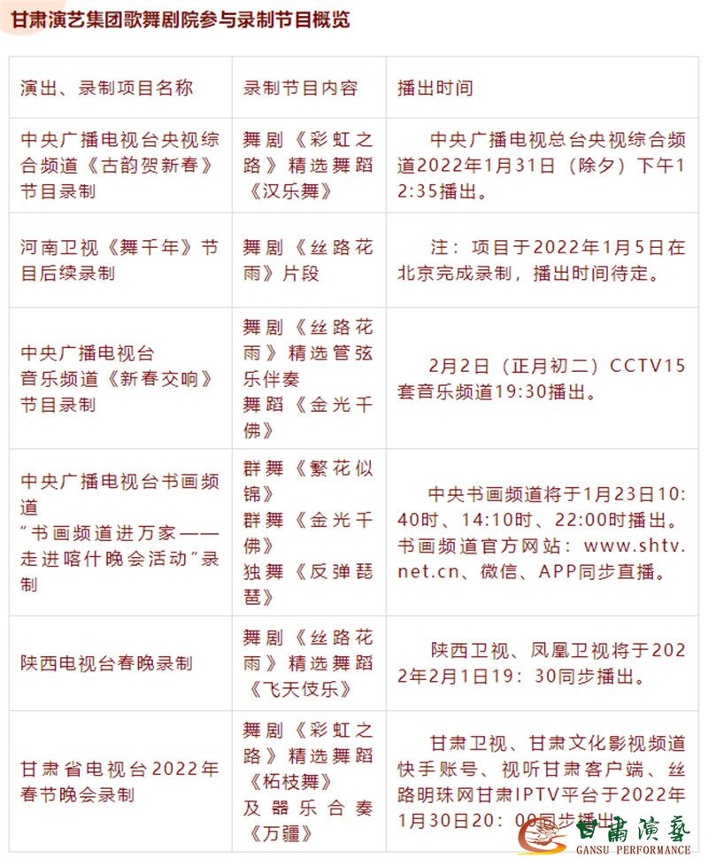 春節(jié)期間,甘肅演藝集團直屬各院團還受邀參加了央視、河南衛(wèi)視、陜西電視臺、甘肅電視臺等媒體的春節(jié)節(jié)目錄制,敬請留意觀看!
