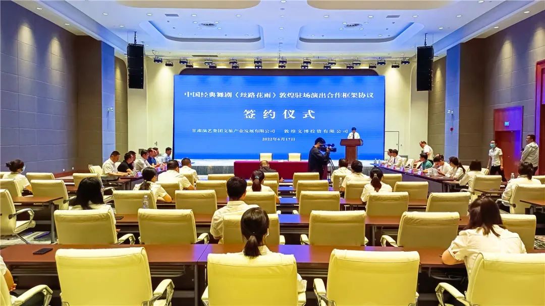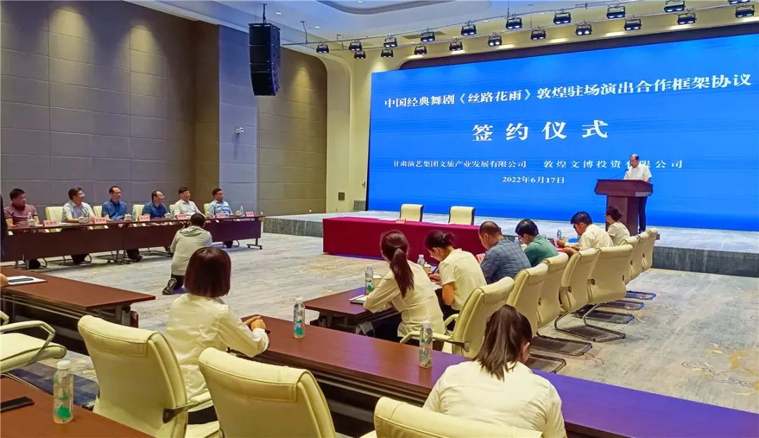 6月17日,甘肅演藝集團文旅產(chǎn)業(yè)發(fā)展有限公司和敦煌文博投資有限公司在敦煌國際會展中心聯(lián)袂舉行中國經(jīng)典舞劇《絲路花雨》敦煌駐場演出簽約儀式。敦煌市政府副市長路育剛,敦煌市文旅局黨組書記、局長陳錦業(yè),敦煌市財政局黨組書記、局長周東,敦煌市國資運營中心主任王海云,敦煌文博投資有限公司黨組織書記、提名董事長孫雪虎 ,以及甘肅演藝集團黨委書記、董事長陳其銀,黨委副書記、總經(jīng)理劉小承等領(lǐng)導(dǎo)出席了當天的簽約儀式。