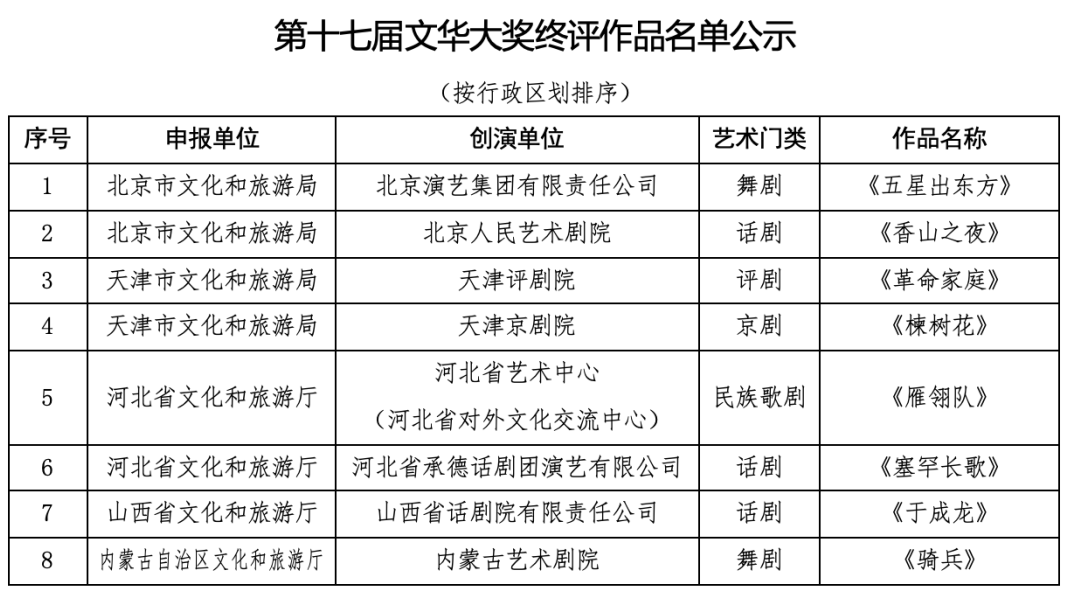 根據(jù)《中國(guó)文化藝術(shù)政府獎(jiǎng)——文華獎(jiǎng)?wù)鲁獭贰吨袊?guó)文化藝術(shù)政府獎(jiǎng)——第十七屆文華獎(jiǎng)評(píng)獎(jiǎng)辦法》有關(guān)規(guī)定,現(xiàn)將第十七屆文華大獎(jiǎng)終評(píng)作品名單和第十七屆文華編劇獎(jiǎng)、文華導(dǎo)演獎(jiǎng)、文華表演獎(jiǎng)“提名人選”名單予以公示(第十七屆文華音樂創(chuàng)作獎(jiǎng)、文華舞臺(tái)美術(shù)獎(jiǎng)無“提名人選”)。入圍終評(píng)的作品和“提名人選”所對(duì)應(yīng)的作品應(yīng)參加第十三屆中國(guó)藝術(shù)節(jié)現(xiàn)場(chǎng)演出,不能參加者視為自動(dòng)放棄評(píng)獎(jiǎng)資格。