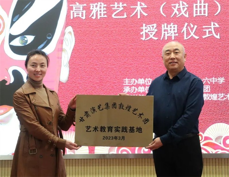 隨后,全體師生共同見證了敦煌藝術(shù)團(tuán)向蘭州市第三十六中授予“甘肅演藝集團(tuán)敦煌藝術(shù)團(tuán)藝術(shù)教育實(shí)踐基地”的牌匾。