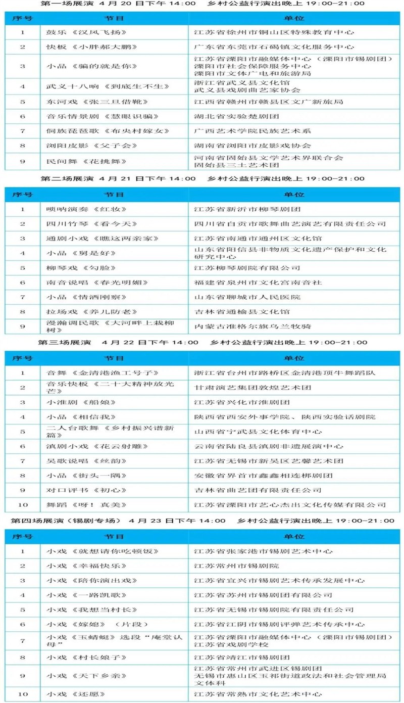 本屆《品質(zhì)溧陽 共赴美好》全國民間文藝展演活動邀請了來自山西、內(nèi)蒙古、吉林、江蘇等18個省市自治區(qū)的共計38部優(yōu)秀作品參加展演,涵蓋錫劇、滇劇、通劇、東河戲、柳琴戲、拉場戲、小淮劇、瀏陽皮影、四川竹琴、嗩吶演奏、鼓樂演奏、快板、武義十八響、南音說唱、吳歌說唱、對口評書、侗族琵琶歌、漫瀚調(diào)民歌、二人臺歌舞、民間舞、小品、音樂情景劇多種表演形式,薈萃了各地特色鮮明的代表性節(jié)目。內(nèi)容豐富、精彩紛呈,為了豐富人民群眾的文化生活,促進城鄉(xiāng)精神文明建設(shè),積極組織參展團隊開展四場“鄉(xiāng)村公益行”演出,在鄉(xiāng)村大舞臺為老百姓送上精彩的文藝盛宴。