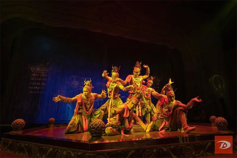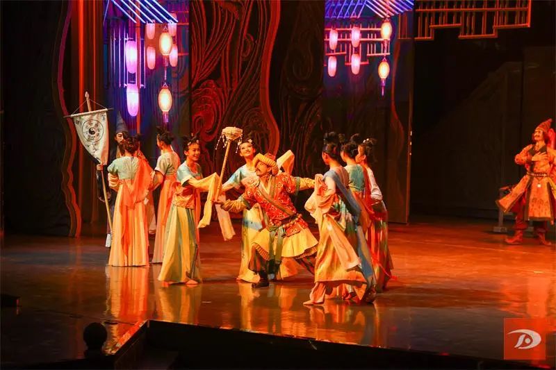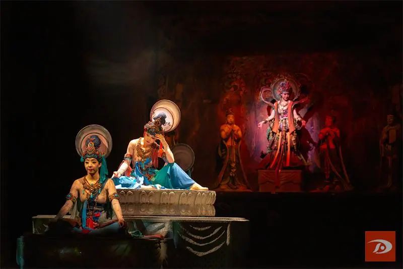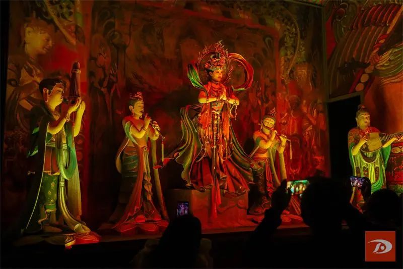 《樂動敦煌》劇目溯源敦煌文化,借助對莫高窟壁畫、藏經(jīng)洞古籍的深度解讀梳理,活化敦煌古樂器、古樂譜研發(fā)成果,采用全息投影、3D威亞等高科技手段,以全沉浸式的呈現(xiàn)方式,演繹了西域少年白氏追尋藝術(shù)的動人故事。劇中運(yùn)用了五弦琵琶、排簫、蓮花阮等民族樂器及敦煌仿制樂器音色,演繹了胡旋舞、腰鼓與琵琶舞、迦陵頻伽舞等多種敦煌舞蹈,配合取材自敦煌古樂譜和西域曲調(diào)的劇目樂曲,還原了敦煌壁畫中的樂舞盛景,全面展現(xiàn)了敦煌傳承千年的古樂文化魅力,帶給觀眾一場全方位的視聽盛宴。