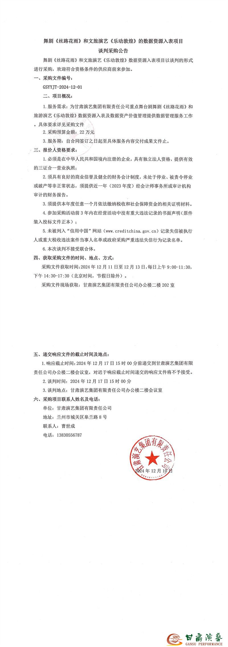 舞劇《絲路花雨》和文旅演藝《樂動敦煌》的數(shù)據(jù)資源入表項目談判采購公告