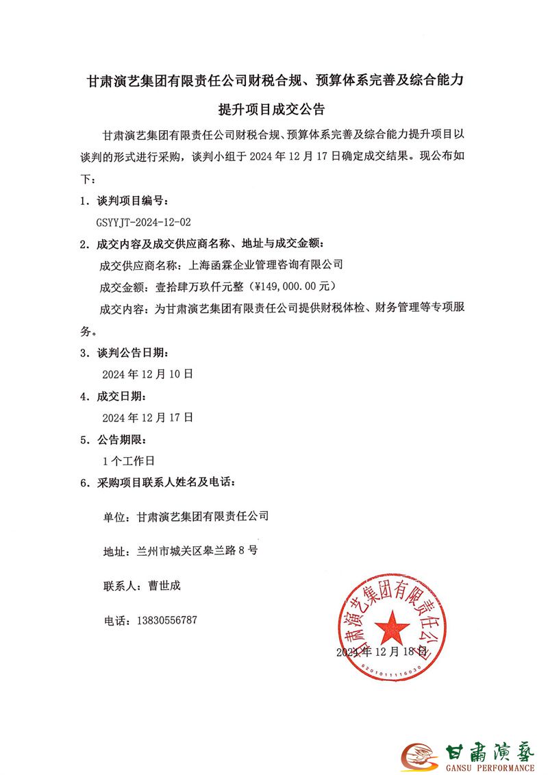 甘肅演藝集團(tuán)有限責(zé)任公司財(cái)稅合規(guī)、預(yù)算體系完善及綜合能力提升項(xiàng)目成交公告