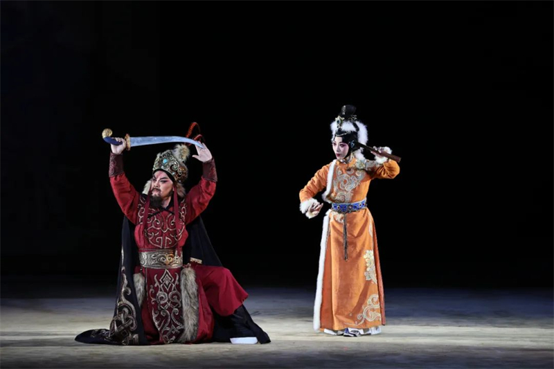 這出戲的文本敘事,一如其同題材作品,圍繞蔡文姬離漢與歸漢兩個關(guān)鍵脈絡而展開。其離漢,有文姬被擄,被妻的舞臺動作;而歸漢,則包含了離別、失憶、喪夫,乃至最后的“流離之魂,終有家園”,得以“勘定舊編,重修青簡”等一系列舞臺行動。顯然,劇作者張泓試圖將蔡文姬歸漢的心路歷程作為塑造其人物形象的重點,予以建構(gòu)和刻畫。編劇的這番用心,或許正是本劇在文學價值層面上有所成就的一個機緣。記得上世紀五十年代末的話劇《蔡文姬》創(chuàng)作,在毫不回避為曹操平反的動機下,左賢王的人物基調(diào)是參照公元前的冒頓單于而確立的,讓劇中的左賢王盡顯匈奴統(tǒng)帥的雄才大略。而上世紀九十年代,那幾出頗具影響的“文姬歸漢”劇目,其中的左賢王形象一股腦地變成舉止謙和的“暖男”,有的甚至圍著蔡文姬前后殷勤,就差對著觀眾打背躬,說這是為了民族和睦。
