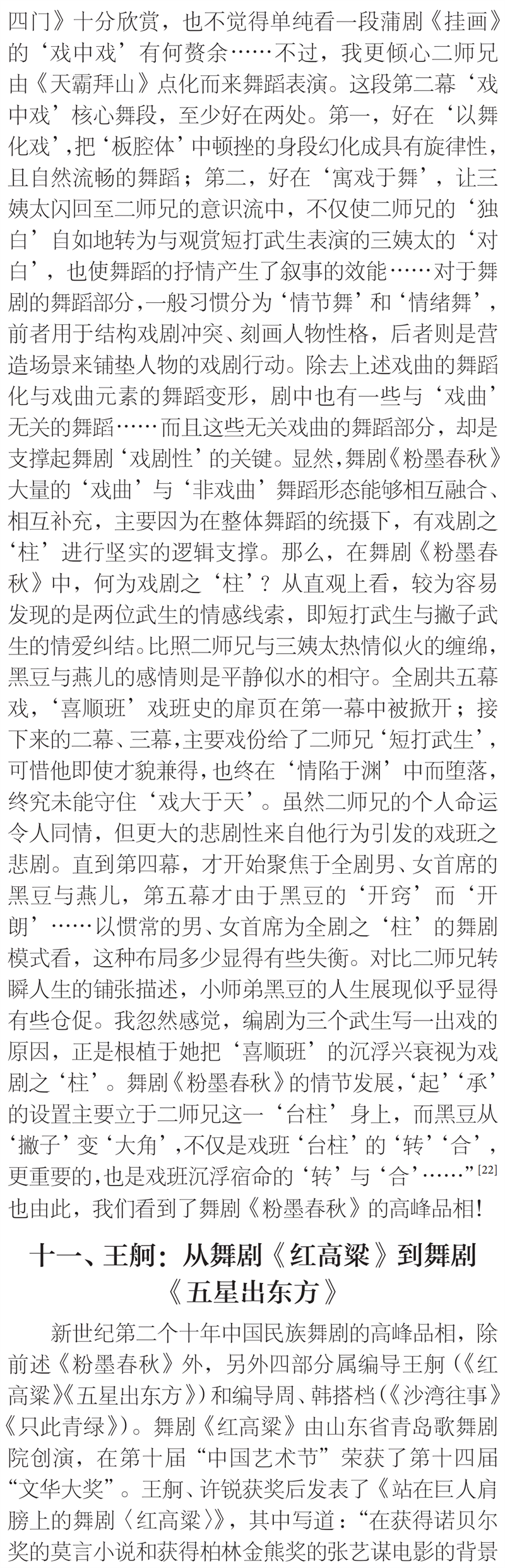 [摘 要] 中國(guó)民族風(fēng)格舞劇,是指這類舞劇敘事的語(yǔ)言風(fēng)格體現(xiàn)出鮮明的“民族性”——包括民族舞蹈語(yǔ)言的古典風(fēng)格、族群風(fēng)格和地域風(fēng)格。討論這類舞劇的高峰品相,一個(gè)重要的前提是面對(duì)那些經(jīng)過(guò)人民認(rèn)可、歷史選擇并體現(xiàn)國(guó)家意志的“經(jīng)典性”作品。本文分析的“經(jīng)典性”作品大約分布在四個(gè)時(shí)期:一是20世紀(jì)90年代中期開(kāi)展的“中華民族20世紀(jì)舞蹈經(jīng)典”的評(píng)展;二是20世紀(jì)90年代開(kāi)啟并實(shí)施的每年一屆的舞臺(tái)藝術(shù)政府獎(jiǎng)——“文華大獎(jiǎng)”的評(píng)選;三是21世紀(jì)頭十年“國(guó)家舞臺(tái)藝術(shù)精品工程”的選拔及逐步與“中國(guó)藝術(shù)節(jié)”同步的“文化大獎(jiǎng)”的評(píng)選;四是近十年(2013—2022)來(lái)四屆(第十屆至第十三屆)“中國(guó)藝術(shù)節(jié)”對(duì)“文華大獎(jiǎng)”作品的確認(rèn)。