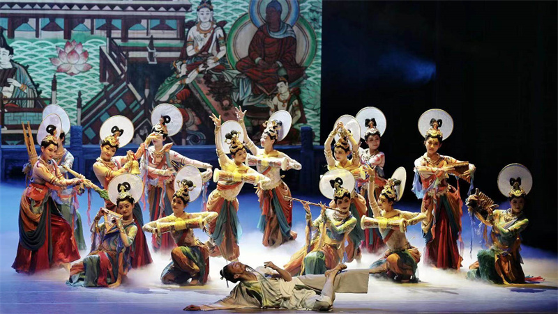 駝鈴陣陣,琵琶悠然,飛天曼妙,敦煌洞窟中的凝固壁畫,化成舞臺上的蹁躚舞姿,絲綢之路的故事在舞者們的演繹中徐徐展開。