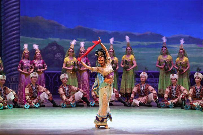 《絲路花雨》的故事“鋪陳”在盛唐時期:在絲綢之路上,各國商旅絡繹不絕,敦煌畫工“神筆張”和女兒英娘救起被困沙漠的波斯商人伊努斯,后卻遇強盜,父女離散,伊努斯出手相助,最終團圓……舞臺上的悲歡離合、生死相助的故事,讓觀眾穿越歷史,感悟友好往來、開放包容的中華文化。《絲路花雨》也成為用舞蹈講述和平之路、繁榮之路、開放之路、創(chuàng)新之路、文明之路的生動故事。