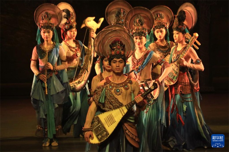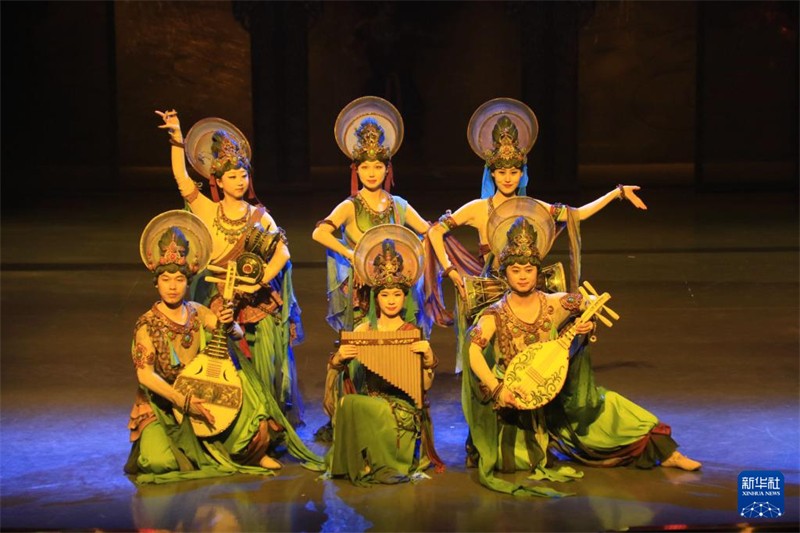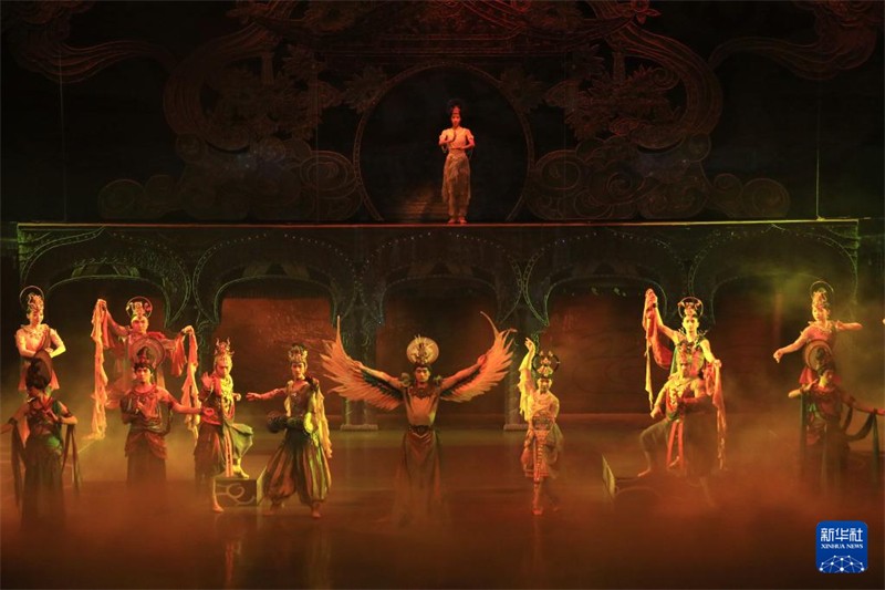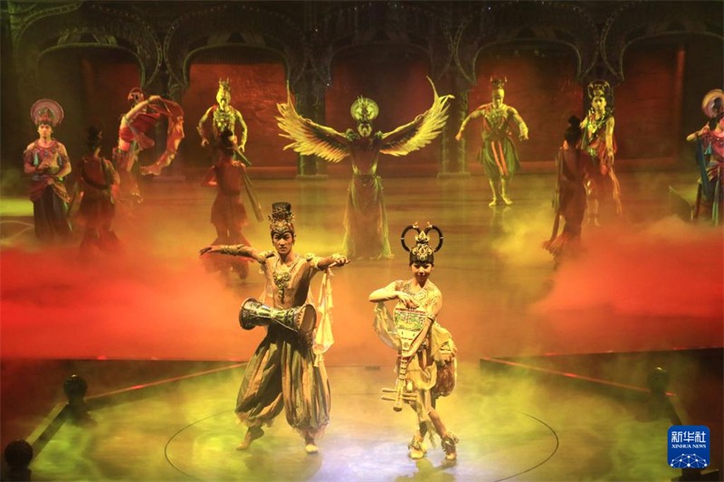 11月16日晚,演員在大型洞窟式沉浸體驗劇《樂動敦煌》中表演。新華社發(fā)(張曉亮 攝)