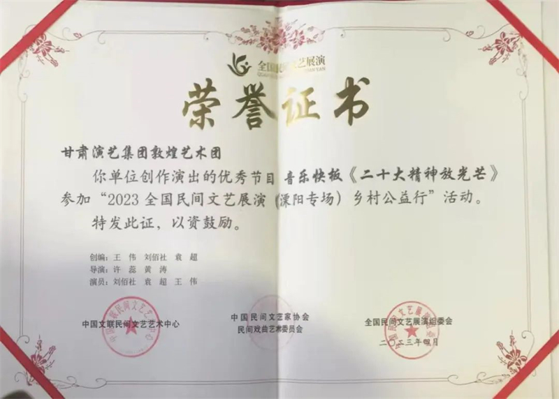 甘肅演藝集團(tuán)敦煌藝術(shù)團(tuán)有幸受邀參加此次展演,本次展演由中國民間文藝家協(xié)會、中國文聯(lián)民間文藝藝術(shù)中心、江蘇省民間文藝家協(xié)會、溧陽市人民政府主辦。中國民協(xié)民間戲曲藝術(shù)委員會、中國溧陽市委宣傳部、溧陽市融媒體中心(傳媒集團(tuán))承辦。