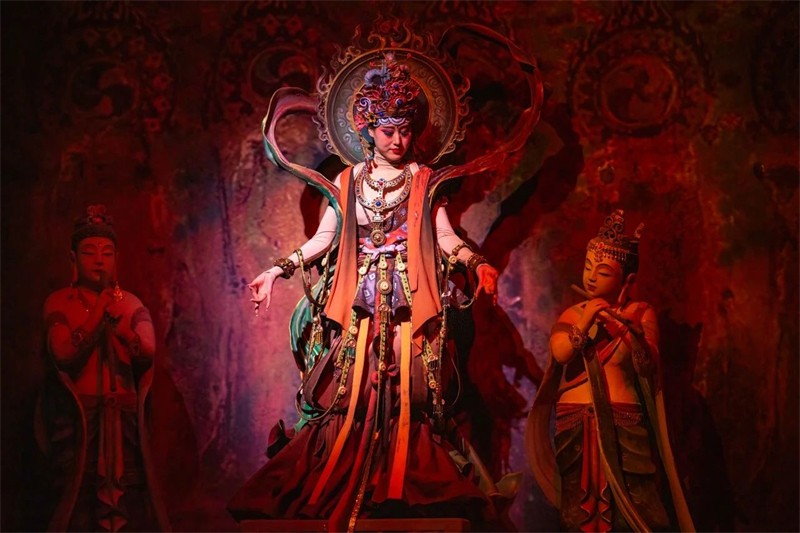 全球首部洞窟式沉浸體驗(yàn)劇《樂動敦煌》,溯源敦煌文化,借助對莫高窟壁畫、藏經(jīng)洞古籍的深度解讀梳理,活化敦煌古樂器、古樂譜研發(fā)成果,采用全息投影、3D威亞等高科技手段,以全沉浸式的呈現(xiàn)方式,演繹了西域少年白歆追尋藝術(shù)的動人故事。