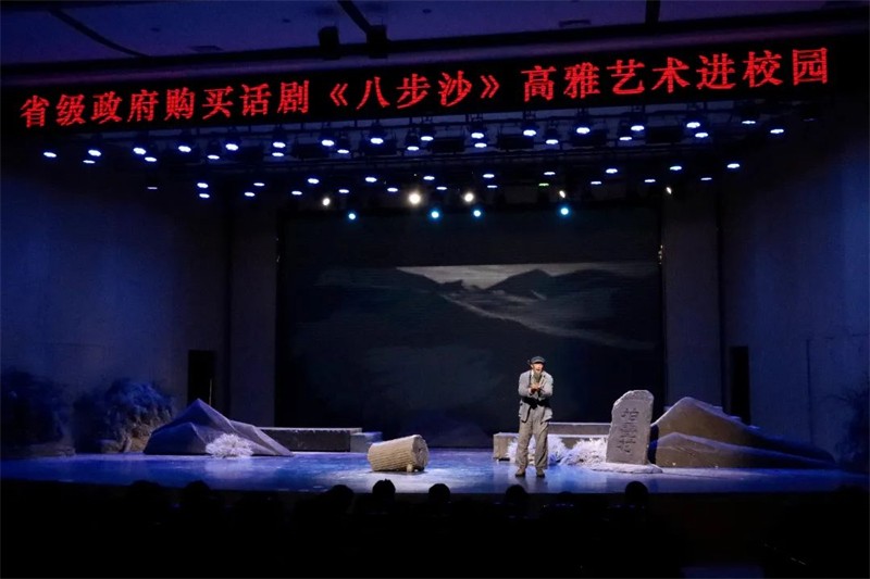 《八步沙》走進(jìn)校園,不光是呈現(xiàn)舞臺(tái)高雅藝術(shù)精品,弘揚(yáng)中華優(yōu)秀文化思想、民族品德,更是對(duì)新時(shí)代年輕人們的一次精神洗禮。日復(fù)一日,年復(fù)一年,“六老漢”的頭白了,八步沙的樹綠了。歷經(jīng)“六老漢”三代人40年的堅(jiān)守,八步沙已從昔日寸草不生的沙漠,變成了當(dāng)?shù)厝罕娫鍪罩赂坏摹敖鹕姐y山”。這是什么?這是“困難面前不低頭、敢把沙漠變綠洲”當(dāng)代“愚公”精神的感悟與思索,這是“甘肅精神的代表,中國(guó)精神的體現(xiàn)”----“八步沙”鮮明的旗幟。