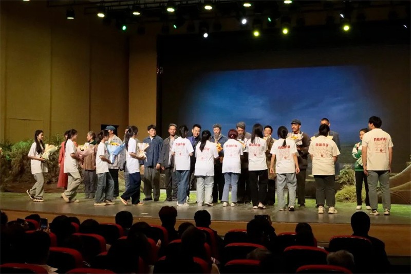 10月10日、11日晚,西北師范大學(xué)音樂廳里再次響起了這感人肺腑的熟悉旋律,現(xiàn)場(chǎng)的大學(xué)生們一起哼唱,臺(tái)上臺(tái)下相融共鳴。這是省級(jí)政府購(gòu)買高雅藝術(shù)進(jìn)校園,甘肅演藝集團(tuán)話劇院原創(chuàng)話劇《八步沙》走進(jìn)西北師范大學(xué)演出的情境。