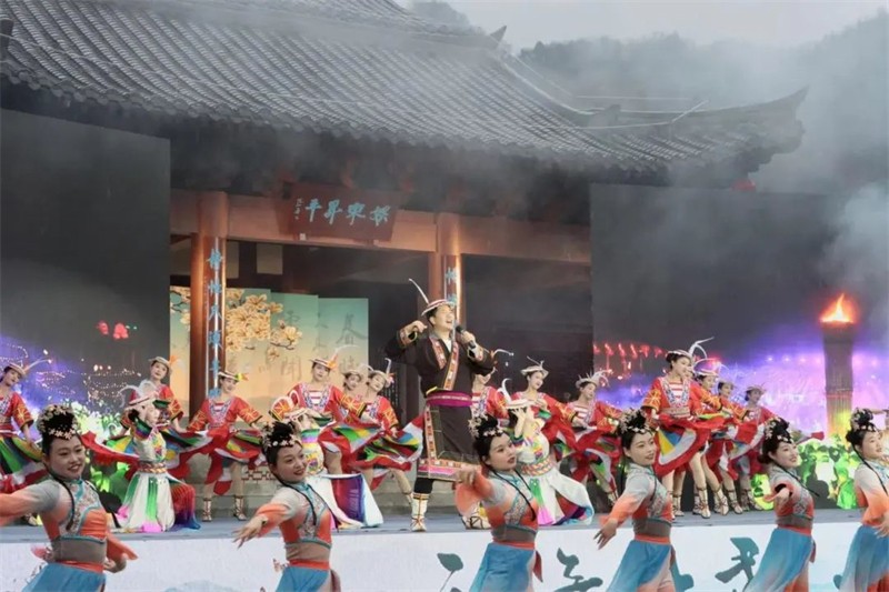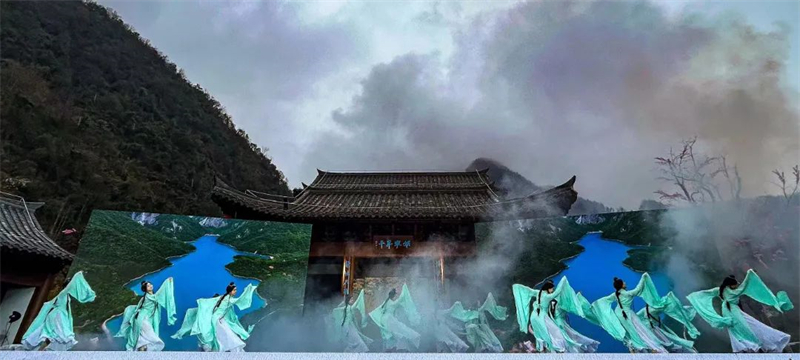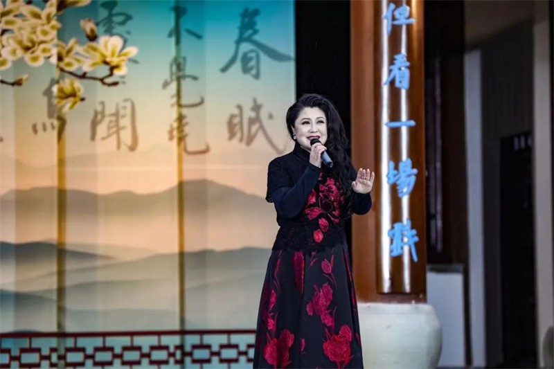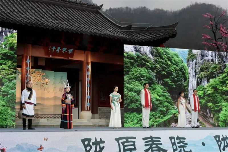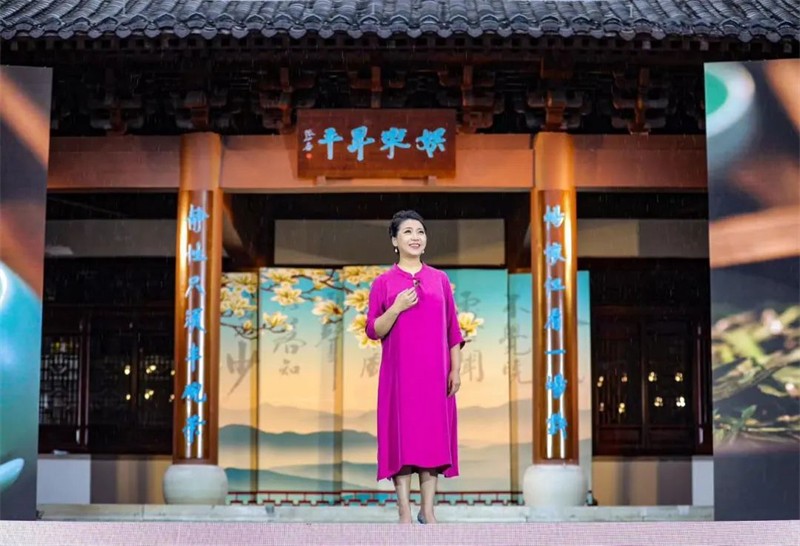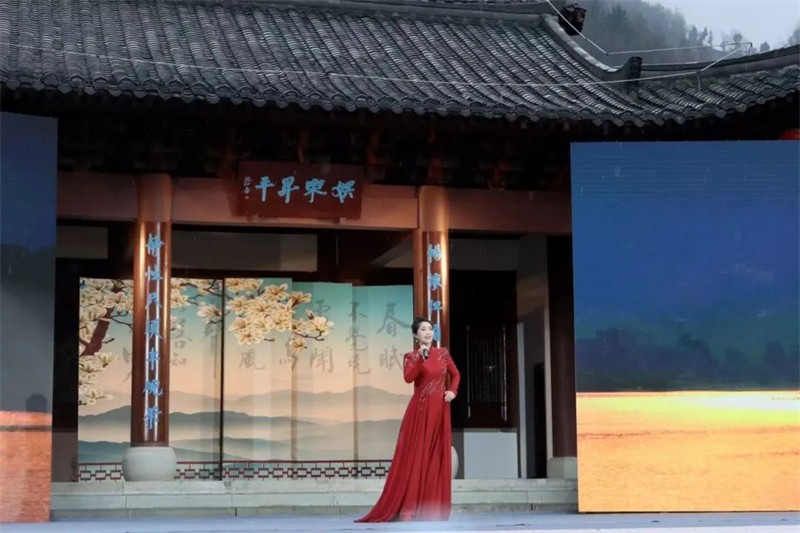 采茶時節(jié),春天清甜的氣息凝結(jié)在新茶的嫩葉上,繁忙而喜悅的采茶姑娘在山間擷取著春的饋贈,當(dāng)?shù)匚乃嚬ぷ髡邘淼摹恫刹栉琛穼㈦]南春茶采集景象展現(xiàn)在舞臺上。元稹《一七令·茶》、賀朝舉《在茶園里喝茶》、嘉陽拉姆《裕河問茶》,古今詩人的詩情畫意和茶藝師讓觀眾領(lǐng)略到隴上江南的茶香。隴南民歌《高山謠》、鄧文德的現(xiàn)代詩《隴南春曉》,用歌唱與詩詞讓人們穿越三千年詩歌長河,享受這春意盎然的人間最美二月天。