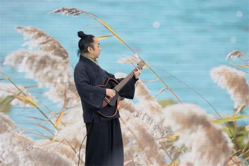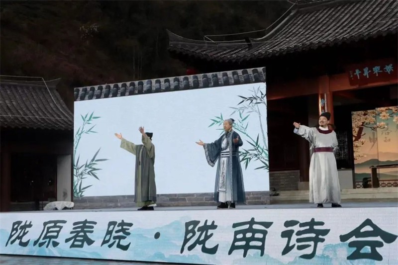 此次詩會別出心裁,以采詩官為主線,將整場詩會串珠成篇,次第鋪展。在采詩官的講述中,觀眾身臨其境開啟了一場水墨畫卷中的詩書樂舞旅程。學(xué)堂內(nèi),學(xué)童們吟誦起膾炙人口的《春曉》,老師正在講授朱自清的《春》,古今文學(xué)經(jīng)典恰如其分地詮釋著觀眾眼前這美麗的初春景象。身著漢唐服裝的女子在白水江碧波、油菜花田的舞臺呈現(xiàn)中翩翩起舞,古風(fēng)舞蹈《春江水暖》向觀眾展示出古代人們迎接春天的喜悅場景。獨(dú)立音樂人李建儐配合古樸的吉他吟唱《詩經(jīng)·秦風(fēng)·蒹葭》,3000多年前,秦隴大地文脈賡續(xù)灼灼光華的盛景躍然觀眾眼前?,F(xiàn)代詩朗誦《春天的謙詞》《碧口》,描摹出詩人亮子和包苞心目中的隴南春日景象,歌曲《心駐碧口》更是將人們對碧口古鎮(zhèn)的熱愛化作美妙的旋律在這片青山綠水間回蕩。情境詩朗誦《蜀道難》《鳳凰臺》將李白與杜甫的傳世名作生動演繹,展現(xiàn)出那個詩人輩出的年代隴南的自然景觀。當(dāng)舞臺上李太白、杜子美與采詩官跨越時空,共同吟誦起婦孺皆知的《將進(jìn)酒》,更是引起了全場共鳴,“五花馬,千金裘,呼兒將出換美酒,與爾同銷萬古愁”的合誦聲將人們帶到了群星璀璨的盛唐。