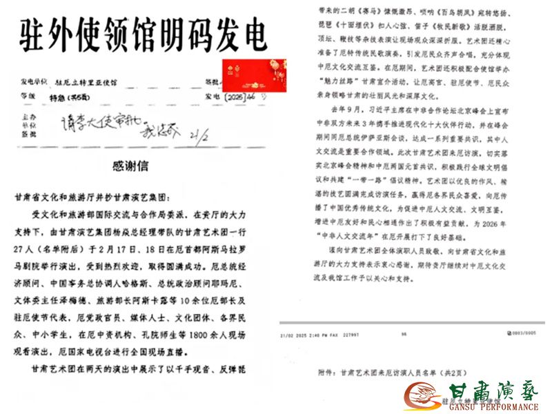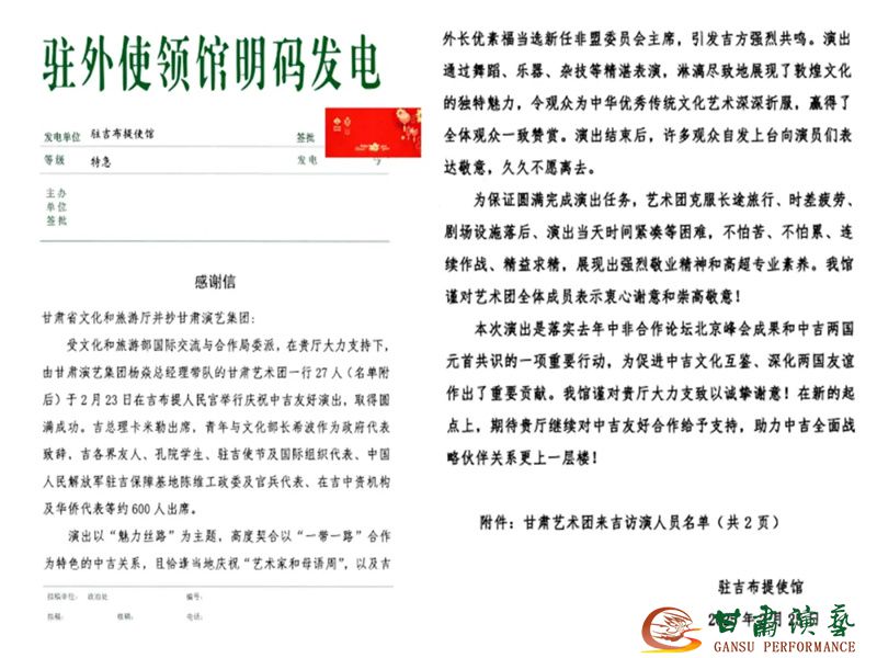演出結(jié)束后駐厄立特里亞使館、駐吉布提使館分別向我們發(fā)來(lái)感謝信,信中對(duì)精彩訪演給予高度評(píng)價(jià),稱演出“讓厄高官、駐厄使節(jié)、厄民眾親身領(lǐng)略甘肅的壯麗風(fēng)光和深厚文化”“為促進(jìn)中吉文化互鑒、深化兩國(guó)友誼作出了重要貢獻(xiàn)”,并盛贊中國(guó)藝術(shù)家“展現(xiàn)出強(qiáng)烈敬業(yè)精神和高超專業(yè)素養(yǎng)”,這既是對(duì)藝術(shù)創(chuàng)作水平的肯定,更是激勵(lì)我們繼續(xù)深耕文化沃土、創(chuàng)新表達(dá)方式的動(dòng)力。