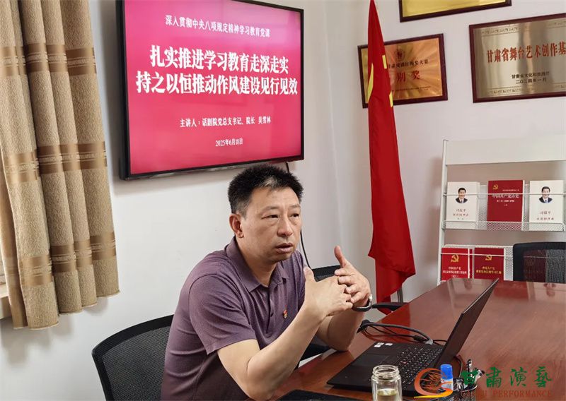 6月18日,甘肅演藝集團(tuán)話劇院黨總支書記、院長吳雪林以“扎實(shí)推進(jìn)學(xué)習(xí)教育走深走實(shí)·持之以恒推動(dòng)作風(fēng)建設(shè)見行見效”為題,向黨總支、班子、黨支部成員,全體黨員,預(yù)備黨員、發(fā)展對(duì)象、入黨積極分子以及中層干部,講授了深入貫徹中央八項(xiàng)規(guī)定精神專題黨課。