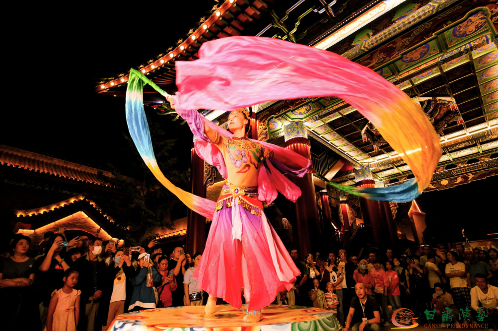 而表演《敦煌新語》的小姐姐除了是甘肅演藝集團敦煌藝術團優(yōu)秀青年演員外,身著的這套服裝,也可謂大有來頭。在去年祖國70華誕國慶閱兵儀式上,“交響絲路 如意甘肅”彩車上的其中一套,就是我們《敦煌新語》舞蹈演員表演時所穿著的服飾。拂云樓下,婀娜多姿的舞蹈演員長袖舞動《敦煌新語》如同壁畫活靈活現(xiàn)栩栩如生。