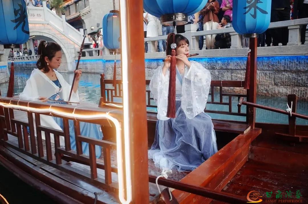 在國潮有范和大美東方區(qū)域,中國傳統(tǒng)樂器在老街亭臺樓閣內(nèi)小橋流水中箏弦合鳴。甘肅演藝集團的樂手們,以傳統(tǒng)民樂為主,又將國潮流行音樂用傳統(tǒng)樂器演奏形式精心改編,體現(xiàn)老街一街千面面面具色的特點,無論獨奏還是和鳴,每場曲目不一但首首精彩,琴聲合奏好像水泉冷澀琵琶聲開始凝結(jié),凝結(jié)而不通暢聲音漸漸地中斷,仿佛江南水鄉(xiāng)伊人在水一方。