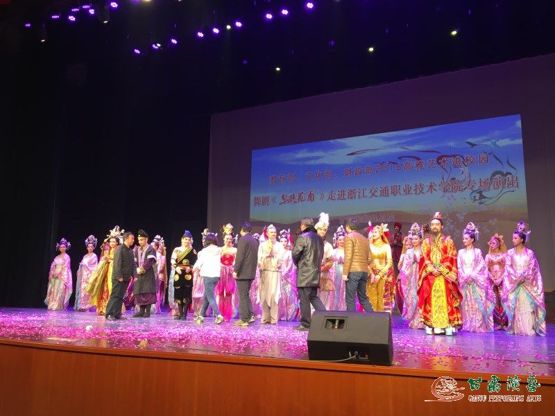 帶著在杭州電子科技大學(xué)及浙江旅游職業(yè)學(xué)院完美演出的無比喜悅,甘肅省歌舞劇院素有“中國舞劇里程碑”、“東方《天鵝湖》”等美譽(yù)的經(jīng)典舞劇《絲路花雨》11月24日晚于浙江交通職業(yè)學(xué)院再次驚艷綻放,繼2015年之后,又一次以傾城一舞成為國家文化部、財(cái)政部和教育部隆重主辦的“2016高雅藝術(shù)進(jìn)校園”眾多參演劇目中脫穎而出、最受廣大高校師生歡迎和喜愛的精品劇目之一,令甘肅省歌舞劇院與甘肅人民共同驕傲與自豪!