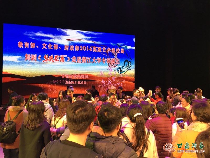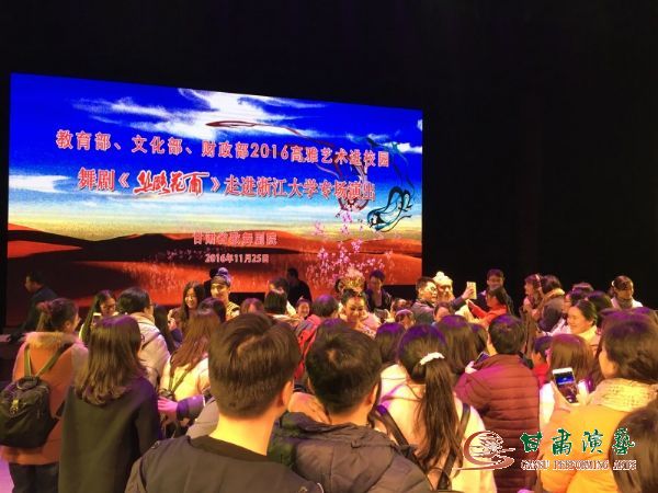 對敦煌壁畫的完美復(fù)活、絲路故事的曲折講述、中外友誼的深情禮贊,讓《絲路花雨》煥發(fā)出無比飄逸、神秘而璀璨的魅力,浙大演出現(xiàn)場,數(shù)千師生完全被經(jīng)典藝術(shù)深深感染和折服,贊嘆之外還是贊嘆、喝彩之外還是喝彩、留戀之外還是留戀,演出結(jié)束時,他們競相上臺與劇組主演等人員合影留念。為表由衷謝意,浙大校方領(lǐng)導(dǎo)除贈送劇組人員珍貴紀(jì)念品外,還與此次巡演帶隊領(lǐng)導(dǎo)甘肅省歌舞劇院藝術(shù)總監(jiān)、副院長張稷、辦公室主任張沛等親切交談,抒發(fā)觀看《絲路花雨》的感慨,并衷心祝愿《絲路花雨》能夠永葆藝術(shù)青春、再為華夏藝術(shù)事業(yè)之繁榮和新的歷史時期共筑“中國夢”與弘揚“一帶一路”偉大戰(zhàn)略思想貢獻全新力量。張稷副院長激情致辭:以對《絲路花雨》的傳承和創(chuàng)新去充分展現(xiàn)敦煌藝術(shù)、甘肅藝術(shù)、西部藝術(shù)及華夏藝術(shù)精髓,使之更好地為甘肅繁榮、中國繁榮特色化服務(wù),是甘肅省歌舞劇院及甘肅人民時刻銘記的光榮使命,以此次高校巡演在浙大完美落幕為契機,《絲路花雨》定會在未來之路不辱使命,越走越好,讓吉祥的花雨播撒祖國每一寸秀麗江山?。▓D文由甘肅省歌舞劇院提供)