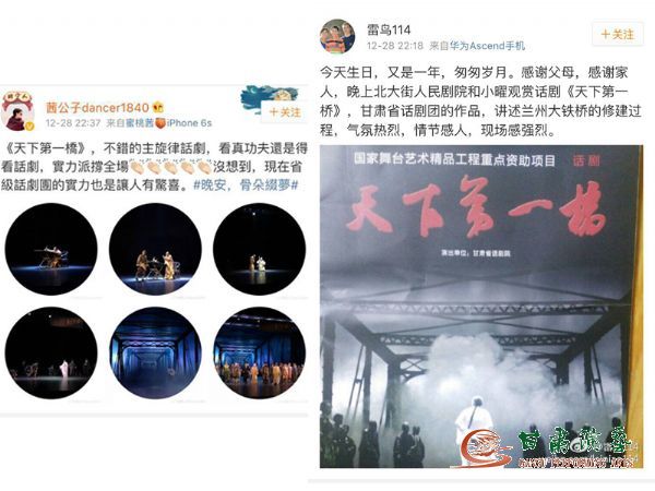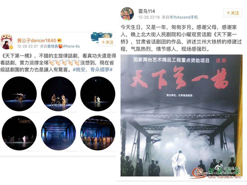 有觀眾在微博評(píng)論說(shuō):“《天下第一橋》,不錯(cuò)的主旋律話劇,看真功夫還是得看話劇,實(shí)力派撐全場(chǎng)沒(méi)想到,現(xiàn)在省級(jí)話劇院的實(shí)力也是讓人有驚喜?!薄敖裉焐?,又是一年,匆匆歲月。感謝父母,感謝家人,晚上北大街人民劇院和小曜觀賞話劇《天下第一橋》,甘肅省話劇院的作品,講述蘭州大鐵橋的修建過(guò)程,氣氛熱烈,情節(jié)感人,現(xiàn)場(chǎng)感強(qiáng)烈。”(圖文由甘肅省話劇院提供)