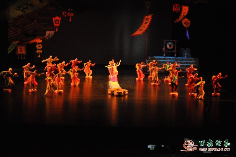 而舞美方面,主要從置景和服裝追求新的突破。置景的設(shè)計與制作,強(qiáng)化數(shù)字視頻制景和硬、軟景制作與道具的拼裝組合,使其便攜拆裝、適應(yīng)巡演運(yùn)轉(zhuǎn)之需的設(shè)計制作,尤其要特別突出舞臺立體展示的三維感、意境化等多視角色彩之效果。新版舞劇服裝設(shè)計以明亮的紅色、黃色、綠色為主基調(diào),大段大段的鮮艷綢緞傾瀉而下,再現(xiàn)了古絲綢之路曾經(jīng)的輝煌。