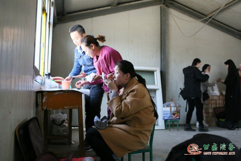 中午12點左右,在經(jīng)過了近1個小時的雖然沒昨天“驚險”,但塵土飛揚,一路顛簸的路途后,甘肅秦腔藝術(shù)劇院的演職人員趕到了清水縣紅堡鎮(zhèn)李店村。同樣簡陋的環(huán)境,同樣的寒冷,同樣的換下厚厚的冬裝,換上單薄的演出服,演職人員們一絲不茍地精心準備著演出。