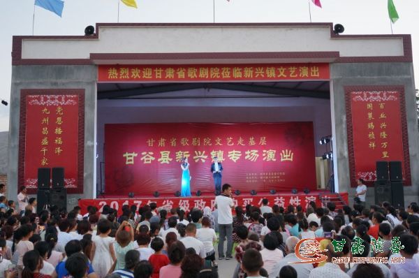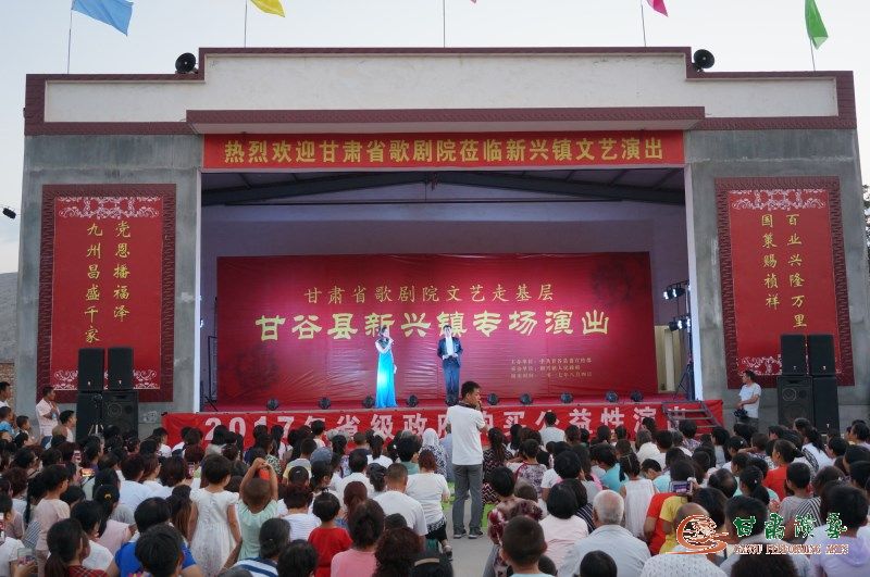 2017年7月30日—8月5日,甘肅省歌劇院在甘谷縣進(jìn)行了2017年政府購買公益性演出。沒有設(shè)施齊全的劇場(chǎng),鄉(xiāng)村簡樸的天然場(chǎng)地卻別有風(fēng)韻;沒有富麗堂皇的舞臺(tái),但臨時(shí)搭建的簡易臺(tái)子,卻把高雅藝術(shù)送到了群眾家門口,將歡樂幸福播撒在鄉(xiāng)間田野。省歌劇院來到大像山鎮(zhèn)、新興鎮(zhèn)、六峰鎮(zhèn)、武家河鎮(zhèn)、謝家灣鄉(xiāng)等五個(gè)鄉(xiāng)鎮(zhèn)慰問演出。連日來,演員們白天頭頂烈日,晚上披星戴月,長途跋涉,給當(dāng)?shù)厝罕娊舆B送去了8場(chǎng)共100多個(gè)精彩紛呈、難得一見的文藝節(jié)目。時(shí)值盛夏,雖然艷陽高照,熱浪撲面,但這絲毫沒有阻擋農(nóng)民群眾火熱的心情。聽說省歌劇院來鄉(xiāng)下慰問演出,群眾像過節(jié)一般高興,奔走相告,用他們發(fā)自內(nèi)心的真誠和熱情迎接遠(yuǎn)方的客人。每場(chǎng)演出,十里八鄉(xiāng)的鄉(xiāng)親們都扶老攜幼,老早趕來,將演出現(xiàn)場(chǎng)圍得水泄不通。