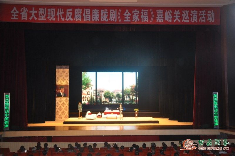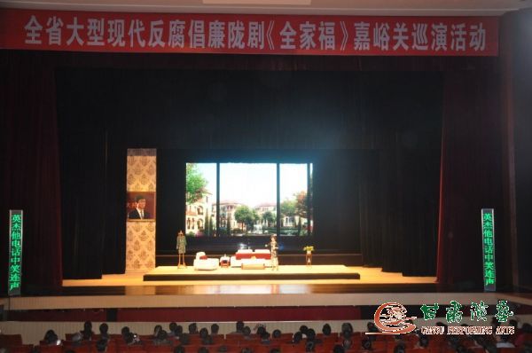 金秋九月,嘉市劇院內(nèi)外,燈火輝煌,座無(wú)虛席,人頭攢動(dòng),掌聲雷動(dòng)。甘肅省隴劇院受嘉峪關(guān)市委市政府邀請(qǐng),于9月26日在嘉峪關(guān)大劇院為嘉峪關(guān)市委、市政府及所屬各機(jī)關(guān)單位等一千余名各級(jí)黨員、干部演出了大型反腐倡廉現(xiàn)代隴劇《全家?!贰4舜尉窘逃莩龌顒?dòng)是在全國(guó)人大代表、國(guó)家一級(jí)演員、梅花獎(jiǎng)得主、省隴劇院副院長(zhǎng)雷通霞同志帶領(lǐng)下,由國(guó)家一級(jí)演員、梅花獎(jiǎng)得主佟紅梅、竇鳳霞以及優(yōu)秀青年演員邵炳德、趙丹、張保利、常小軍、樊麗等一大批中青年業(yè)務(wù)骨干為代表的強(qiáng)大陣容演出。各級(jí)黨員、干部在觀看席上鴉雀無(wú)聲,受到了極大地觸動(dòng)和警醒。嘉峪關(guān)市委、市政府、人大、政協(xié)和有關(guān)方面主要領(lǐng)導(dǎo)同志觀看了警示教育演出,并給予了充分肯定和高度評(píng)價(jià)。
