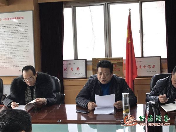 會(huì)議由院長助理王為民同志主持,王存院長轉(zhuǎn)達(dá)了省委宣傳部副部長、省文化廳黨組書記、廳長高志凌同志對省隴劇院的批示及高志凌廳長《在2018年全省文化和新聞出版廣播影視工作會(huì)議上的講話》;王為民助理全文傳達(dá)了省文化廳黨組成員、副廳長楊建仁同志《在省隴劇院領(lǐng)導(dǎo)干部宣布大會(huì)上的講話》及《文化要訊-----省隴劇院召開全體職工大會(huì)宣布王存任院長》等。