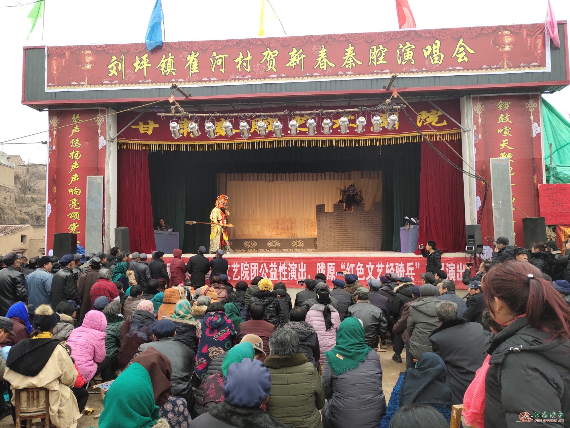 連日來,甘肅秦腔藝術劇院的演職人員克服連場演出勞累、天氣寒冷、條件艱苦等困難,在完成正月初二以來的多個地點的演出任務后,于2月22日從甘南臨潭縣古戰(zhàn)村轉戰(zhàn)秦安縣崔家河村為當?shù)厝罕娧莩?,連續(xù)為當?shù)厝罕娧莩?、大型秦腔優(yōu)秀傳統(tǒng)劇目忠保國》、《周仁回府》、《金沙灘》、《火焰駒》、《竇娥冤》、《趙氏孤兒》、《玉堂春》和秦腔經典折子戲《梳妝.掛畫》、《花云帶箭》、《殺廟》、《古城會》等。在為期6天12場的演出中,國家一級演員、梅花獎得主蘇鳳麗,國家一級演員賀忠宏、溫彩霞,劇院優(yōu)秀中青年演員陳永勝、郭凱杰、陳金芳、馬永紅、高二強等輪番登臺演出,讓當?shù)厝嗣袢罕娫诖汗?jié)期間享受到了一道道秦腔大餐,豐富了當?shù)厝嗣袢罕姷木裎幕睢?