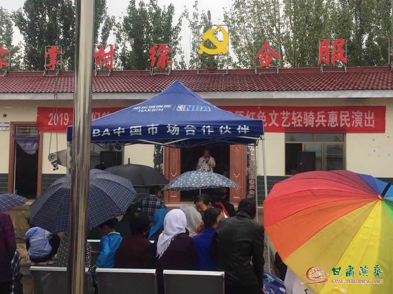 在傾盆大雨中,熱情的觀眾們打著雨傘不愿離去,他們唉聲嘆氣,議論紛紛,“好不容易能看一場省上的演出了,結(jié)果剛開始就下雨了”他們遺憾地說道。半個多小時過去了,雨勢不減。看著群眾們期盼的眼神和雨中等待的不易,帶隊領(lǐng)導(dǎo)征求演職人員意見后,將演出移至村文化活動室進行。由于文化活動室狹小,甘肅演藝集團秦腔藝術(shù)劇院的演職人員和村干部們一道在活動室門口打起了為群眾們遮雨的雨棚。